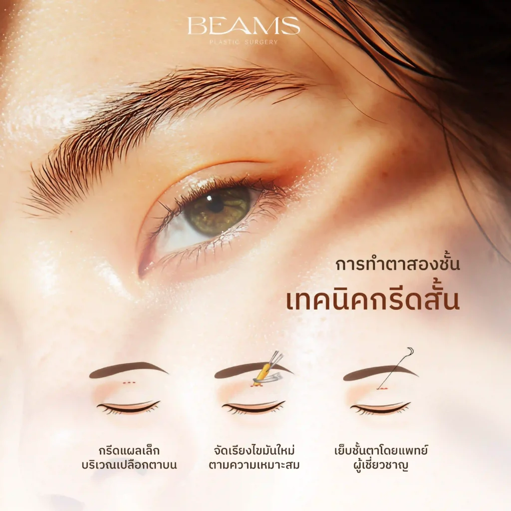 เทคนิคการทำตาสองชั้น ที่คุณหมอบีมใช้ในการผ่าตัดตกแต่งเปลือกตาให้เป็นตาสองชั้นที่สวยงามนั้น แบ่งออกเป็น 2 เทคนิค การทำตาสองชั้น เทคนิคกรีดสั้น (Short incision) เหมาะกับคนอายุน้อย ที่ไม่มีปัญหาหนังตาตก หนังตาเกิน ชอบชั้นตาแบบธรรมชาติ คล้ายกับการศัลยกรรมตาเกาหลี การทำตาสองชั้น เทคนิคกรีดยาว (Long incision) เหมาะกับคนที่มีไขมันหนังตามาก มีหนังตาเกิน เช่น คนที่เริ่มมีอายุมาก คนที่มีไขมันสะสมบริเวณเปลือกตามาก มีลักษณะเปลือกตาหย่อนคล้อย หรือคนที่มีภาวะกล้ามเนื้อตาอ่อนแรง