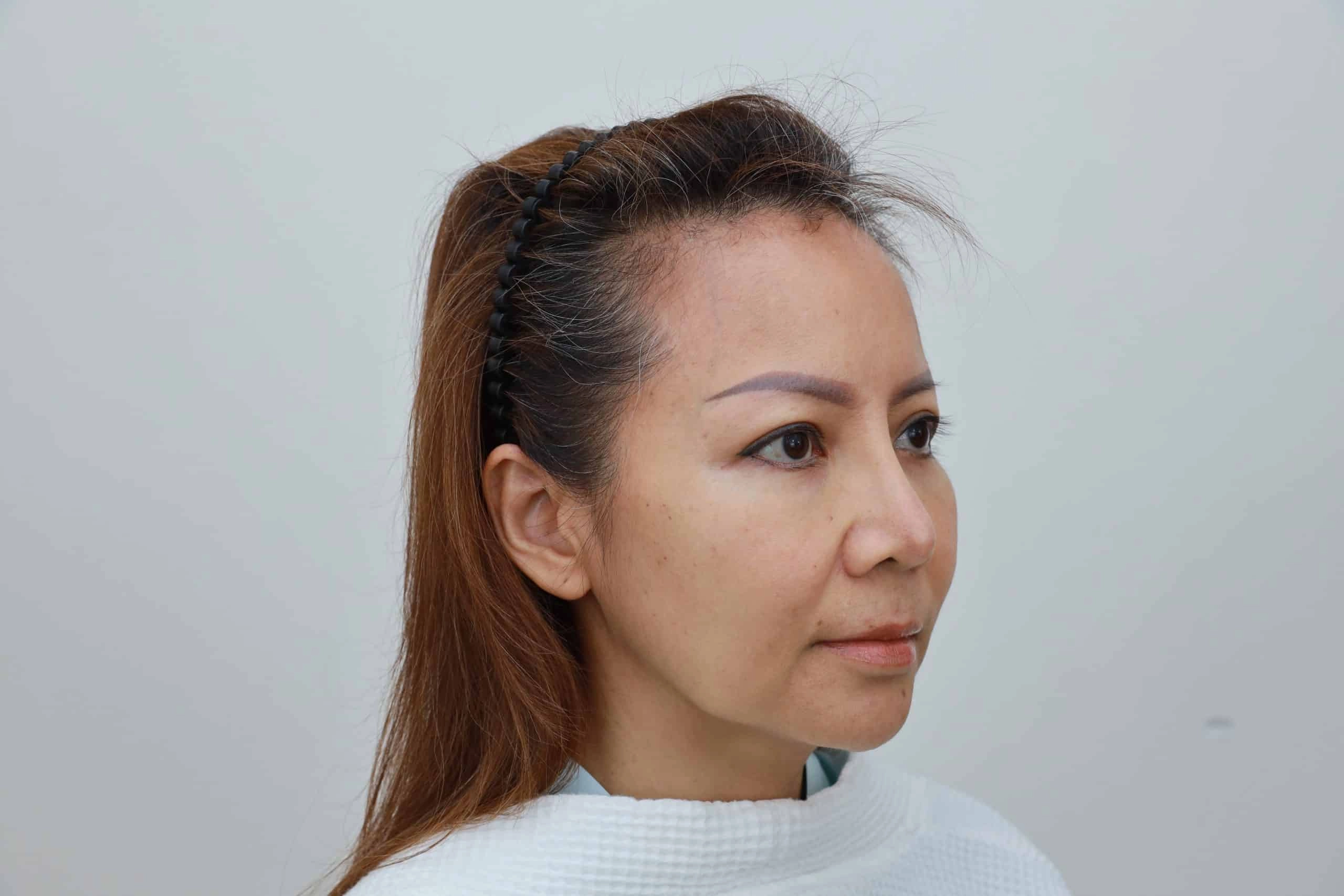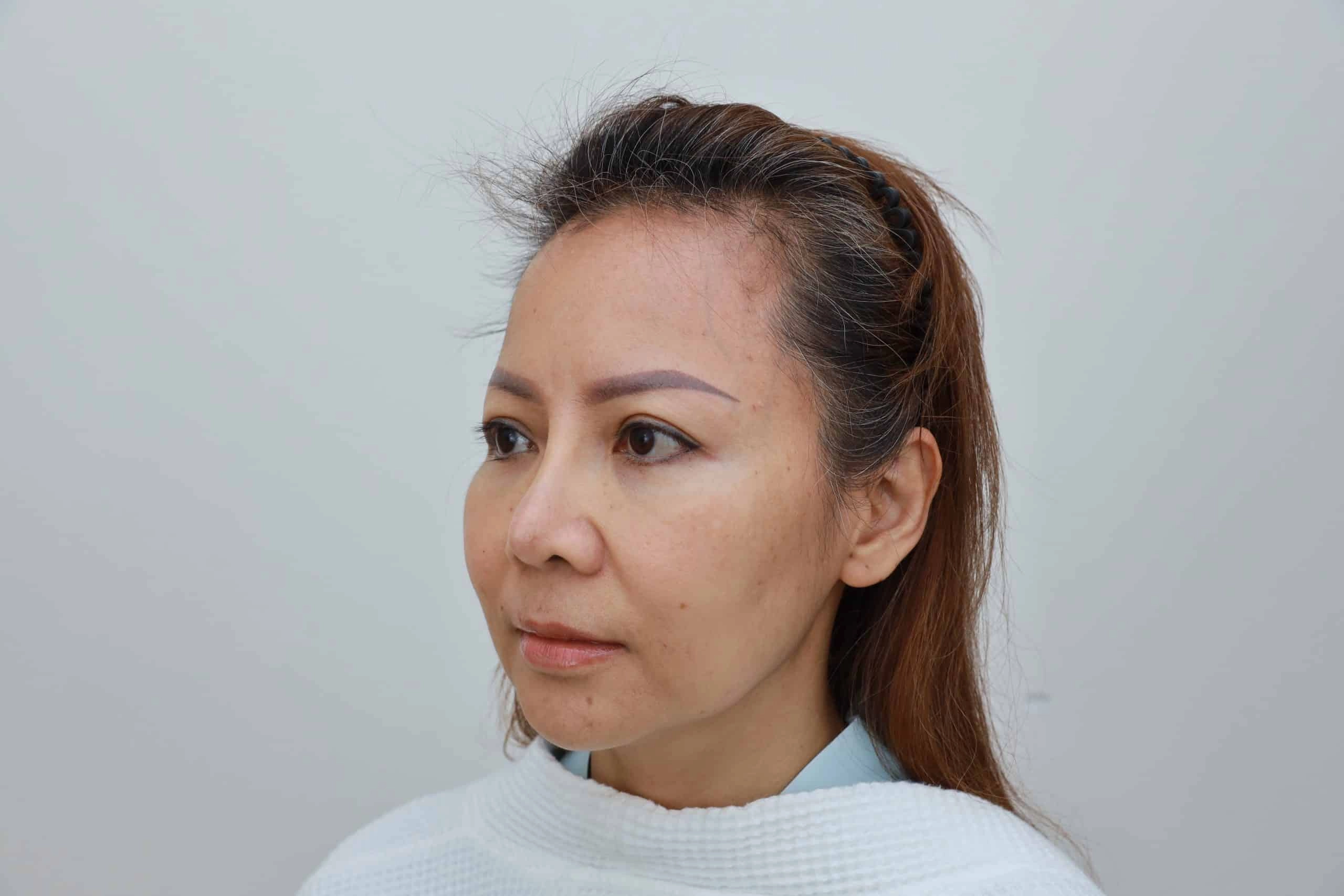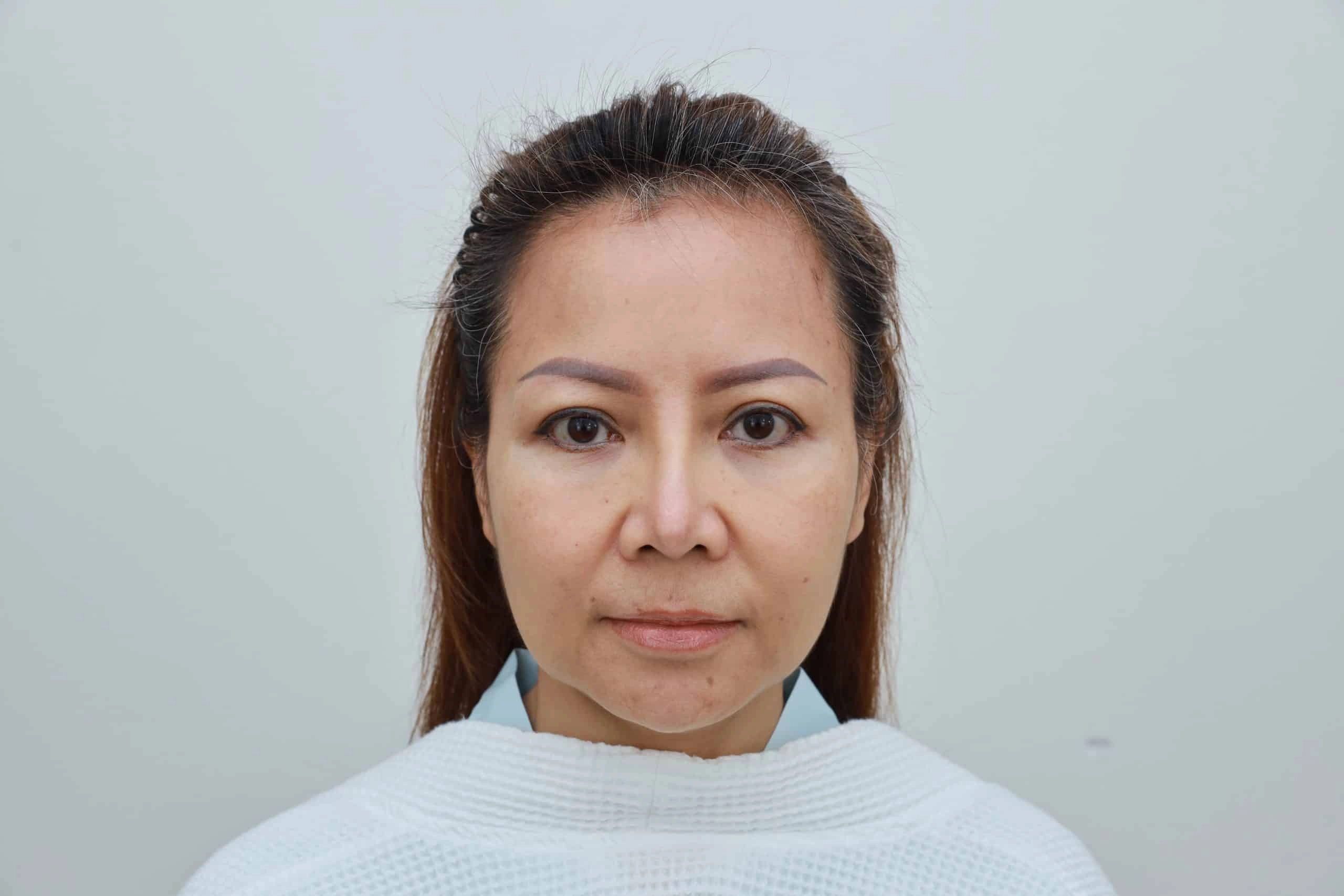 ก่อนทำ คุณบีมีปัญหา ร่องแก้มลึก ร่องน้ำหมากชัดเจน คิ้วตก หางตาตก และ ใบหน้าหย่อนคล้อย ทำให้ดูมีอายุ