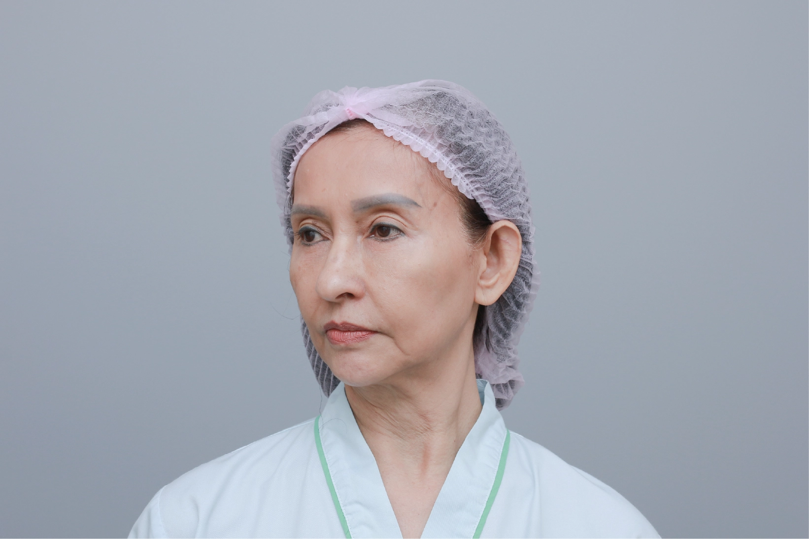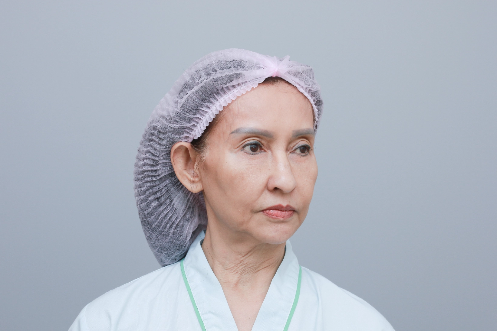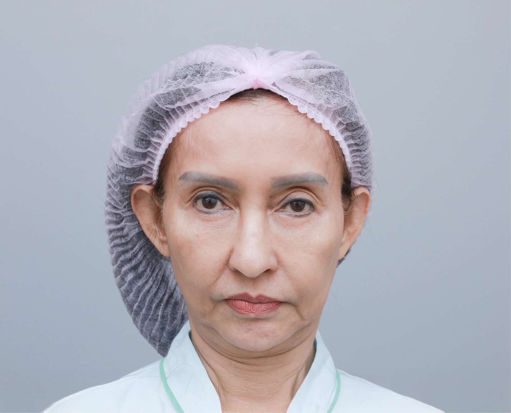 คนไข้เคสนี้เป็น Influencer มาด้วยปัญหาหน้าหย่อนคล้อย มีริ้วรอยร่องลึก ลำคอหย่อนคล้อย มีรอยเหี่ยวย่น จนเห็นรอยพับที่คอชัด ทำให้เวลาถ่ายรูปแล้วรู้สึกไม่มั่นใจ ต้องแต่งรูปเยอะ เคยฉีด Filler ร้อยไหม Endotine Ultraformer และ Ulthera มาหมดแล้ว แต่พอเริ่มอายุมากขึ้น ก็เริ่มไม่ได้ผล เลยตัดสินใจปรึกษาหมอ เพิ่มทำหัตถการดึงหน้า (Facelift) และยกกระชับผิวลำคอ (Neck lift) หลังผ่าตัดดึงหน้าและดึงยกกระชับผิวบริเวณลำคอ พบความเปลี่ยนแปลงชัดเจน คือหน้าแก้มยกกระชับ ผิวเรียบขึ้น ไม่มีกระเปาะแก้ม หน้าดูเรียวขึ้น ริ้วรอยร่องลึกต่างๆ บนผิวหน้าลดลงอย่างเห็นได้ชัด ผิวลำคอเรียบเนียนขึ้น นอกจากนี้ยังแก้ไขหางตาตก มุมปากตก ทำให้หน้าดูสดใสขึ้น ดูเด็กลง เหมือนย้อนวัยได้